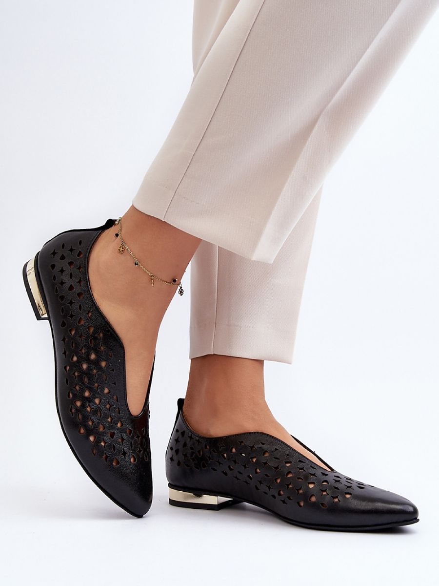 Women’s ballerinas made of natural leather. The almond-shaped nose will optically slenderize the legs. Leather insole will provide comfort during use. Model with openwork upper. Ideal for many spring-summer stylings! You absolutely must have them!