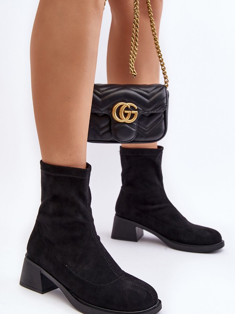 Women’s slip-on boots made of eco-suede. Set on a low block heel. Rounded toe caps. Ankle-length upper. Classic cut, which you will match with almost any autumn styling!