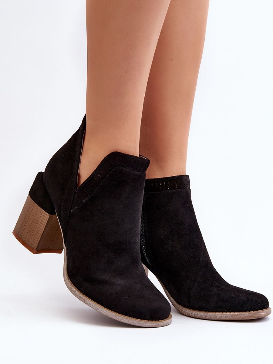 Women’s boots made of pleasant to the touch eco-suede. Set on a massive post. Ankle-length upper with a cutout and openwork pattern. Zippered closure. Rounded toes. Eco leather insole will ensure comfort while wearing. Perfect for spring styling!