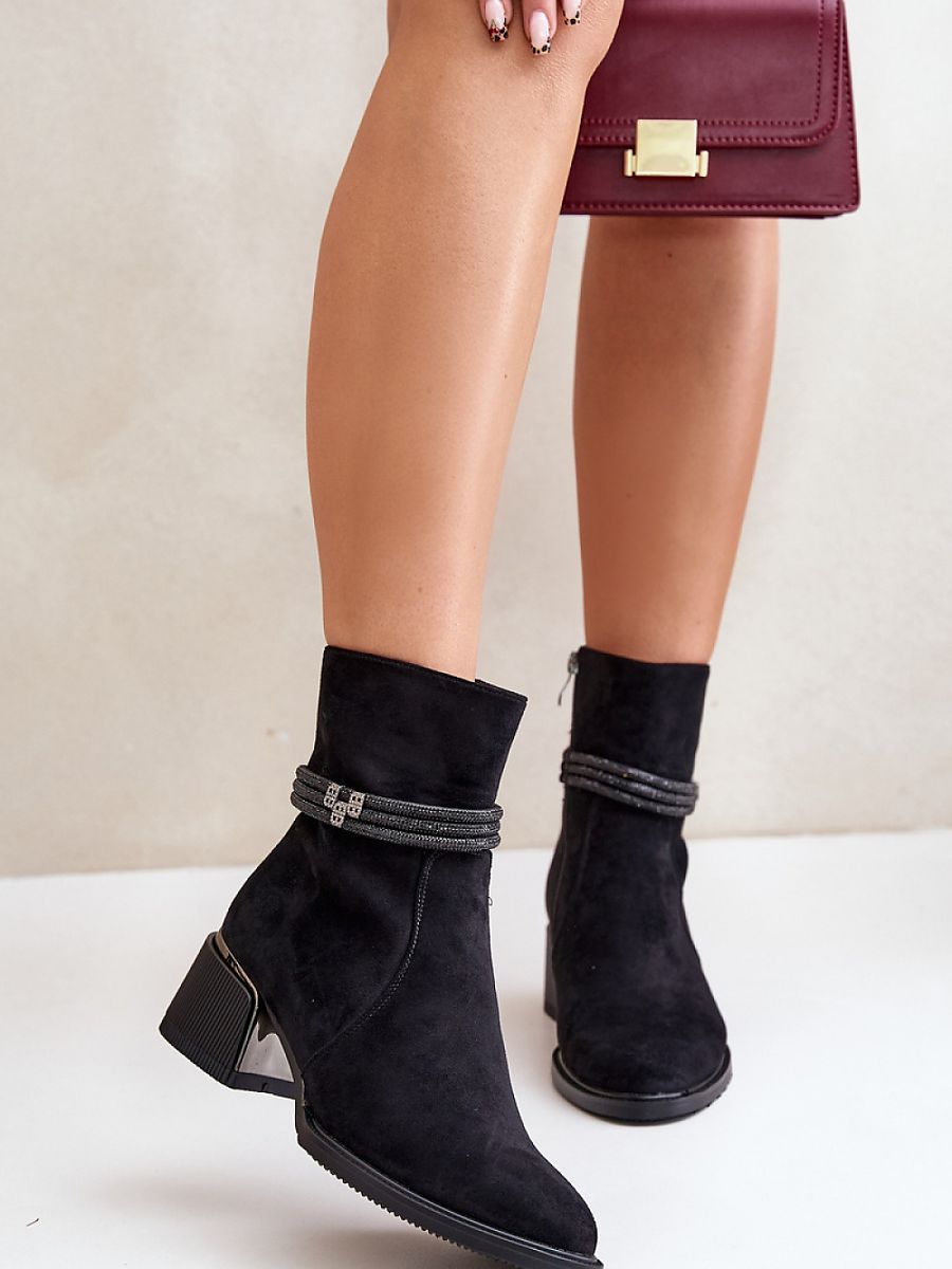 Women’s boots made of high-quality eco-suede. Set on a low heel. Almond toes. Interior insulated with shoe blanket. Fastened with a zipper. The main asset of this model is the shiny stripes on the upper.