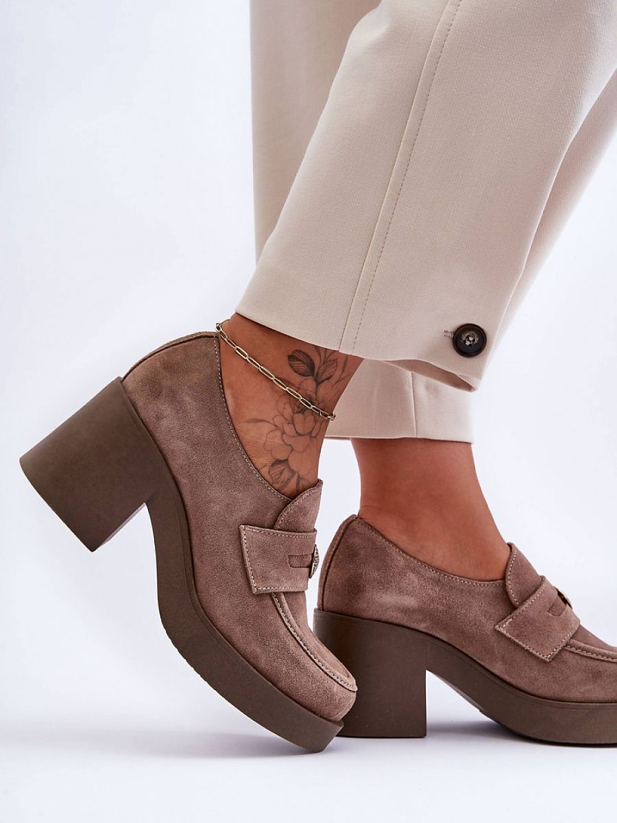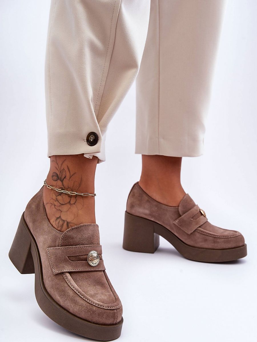 Women’s heeled half shoes with an upper made of natural leather. The interior is also covered with natural leather, thanks to which they are very comfortable to wear. The stylish heel in the form of a wide post will provide stability at every step. In addition, under the tongue there is a tightening elastic band, which will make the shoe perfectly fitted to the foot. This model has a padded heel counter and a small decoration on the strap.