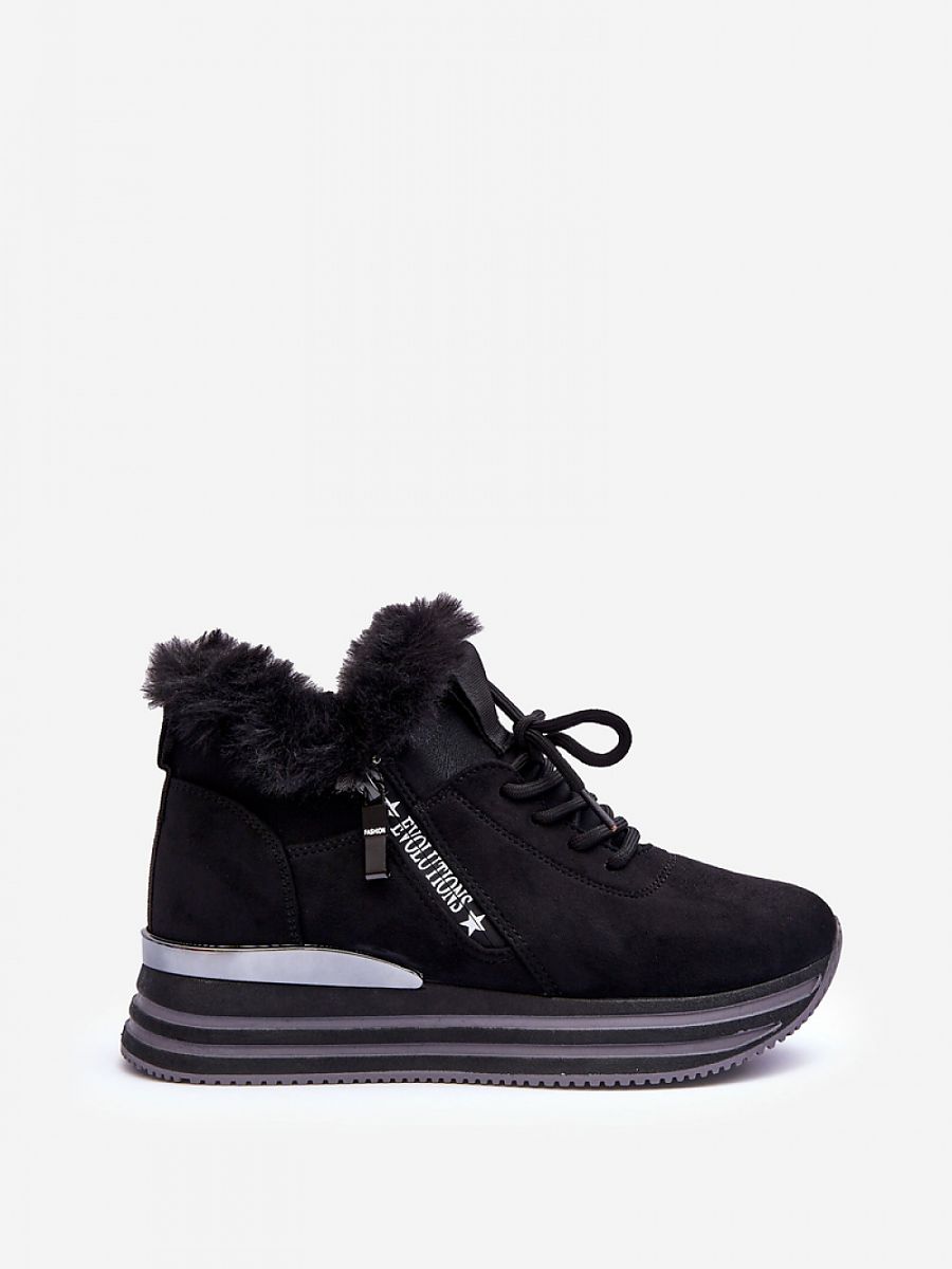 Women’s sports shoes were made of eco-suede. The model is set on a platform with a mirrored element at the back. Zippered on the outer side of the upper and additionally laced. A soft insole will ensure comfortable use of the footwear. The top of the upper is decorated with fur. Inside, the shoes are insulated with a shoe blanket.