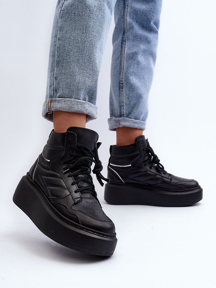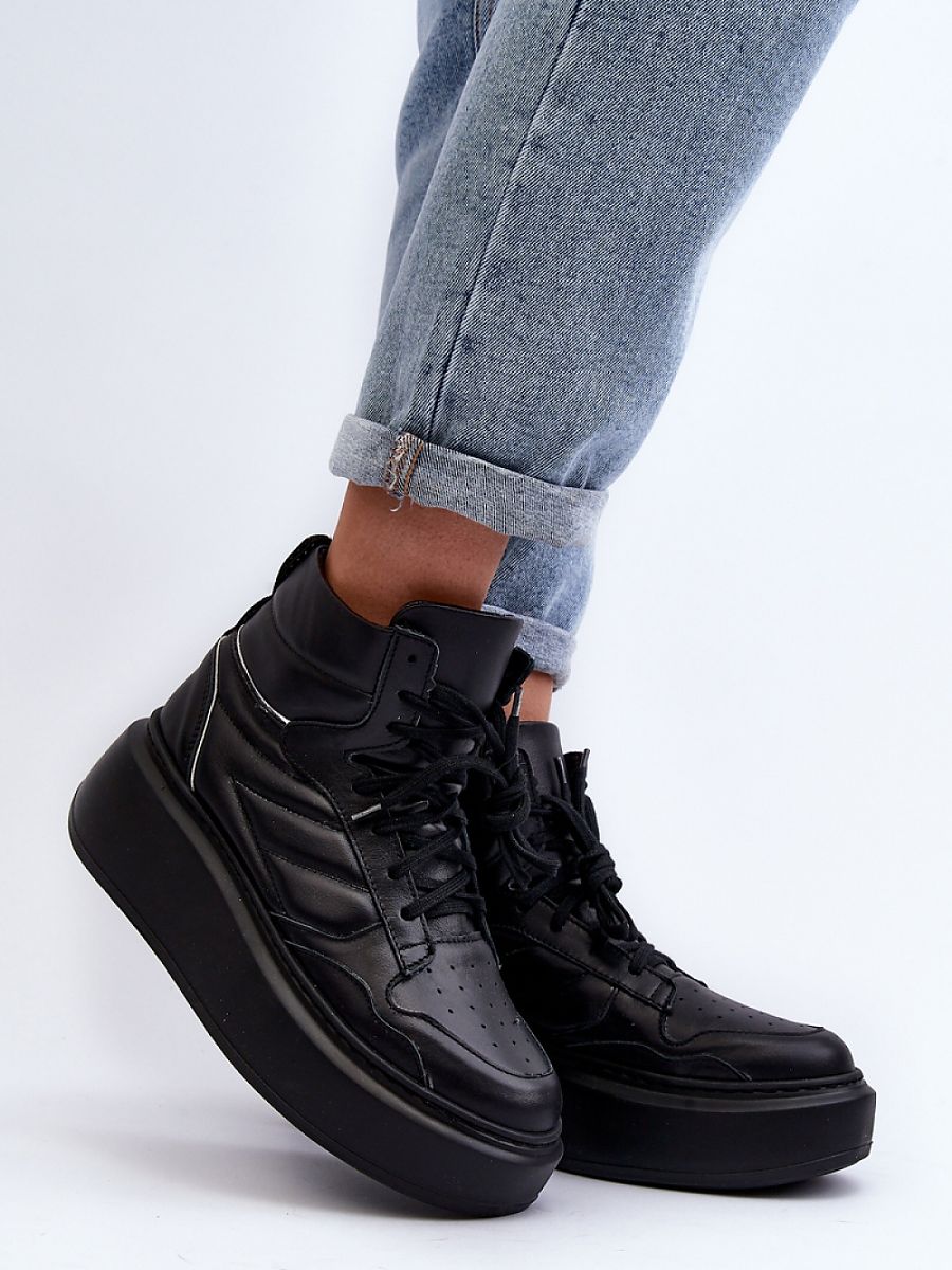 Fashionable women’s sports shoes made of natural leather. Set on a massive platform. Upper behind the ankle. Rounded toe. Model with classic lacing. Ideal for spring days! This cut is sure to please you!