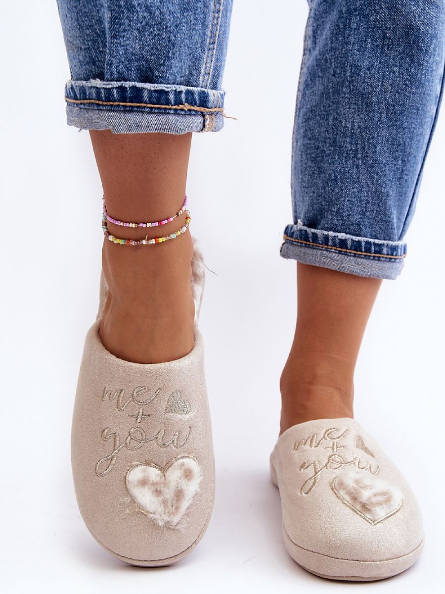 Shiny women’s slippers decorated with an inscription and a heart. Slip-on model with covered nose. Set on a thick sole. Insole insulated with fur.