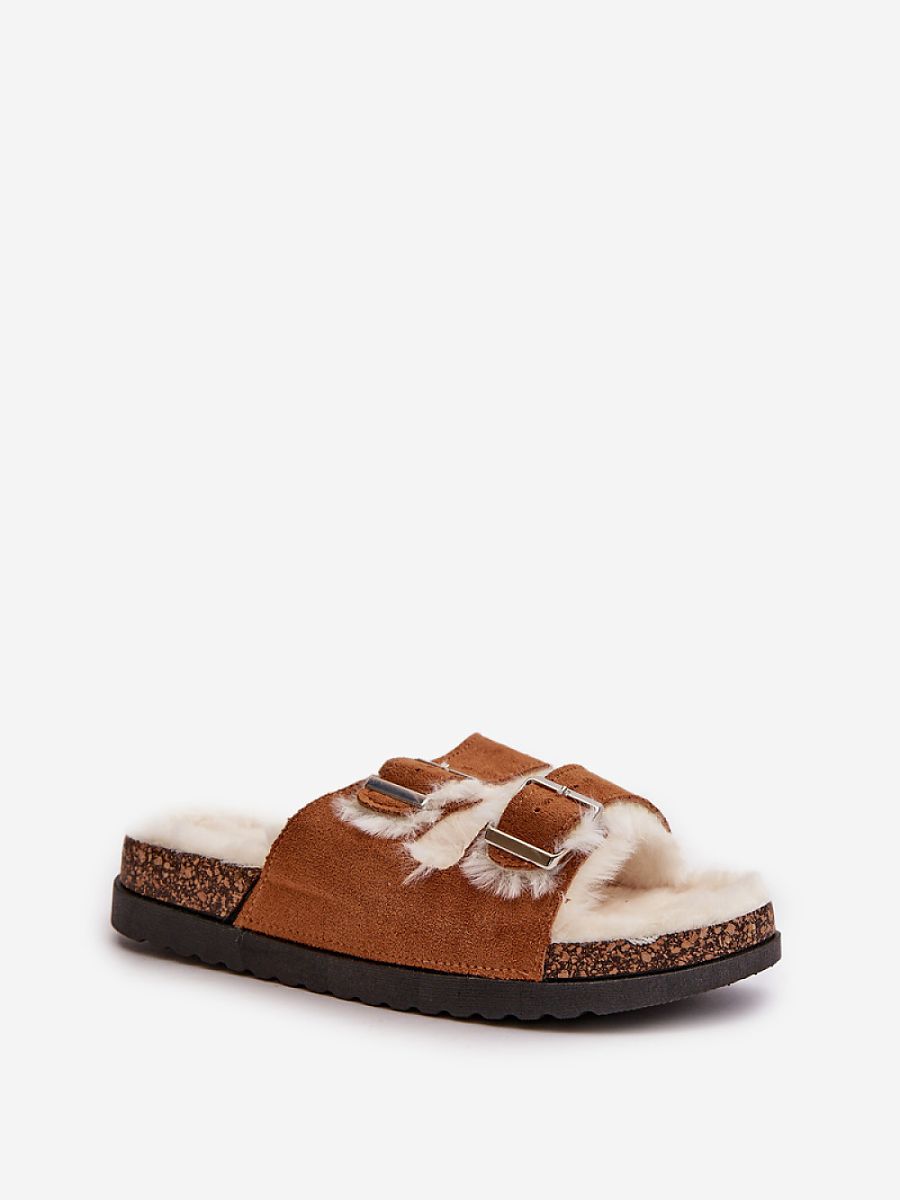 Women’s slippers with soft fur lining, providing warmth and comfort on colder days. They have two adjustable straps with buckles, allowing for a perfect fit to the foot. Set on a platform, they add a bit of height while providing stability and comfort. Perfect for relaxing moments at home.