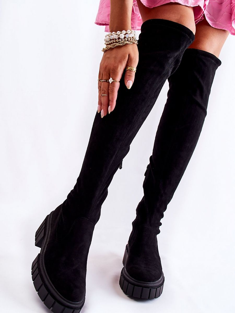 Beautiful women’s boots with an upper over the knee. The model was made of pleasant to the touch eco-suede. Fastened with a zipper on the side of the upper. In addition, the boots have a binding, thanks to which they can be properly adjusted. The model is set on a massive flat heel and platform. The boots have warming in the form of a shoe blanket only at the height of the foot. The heel counter is padded.