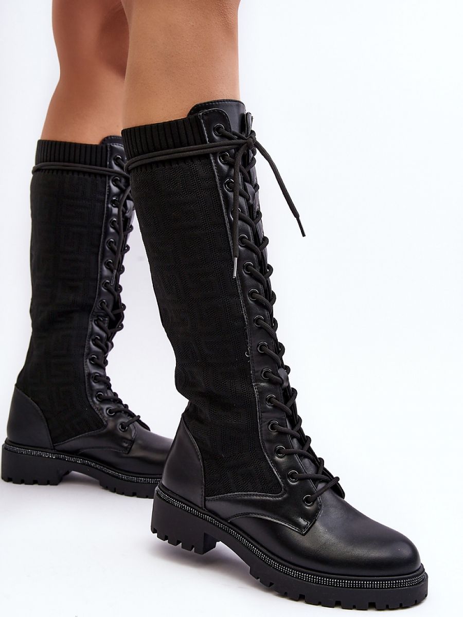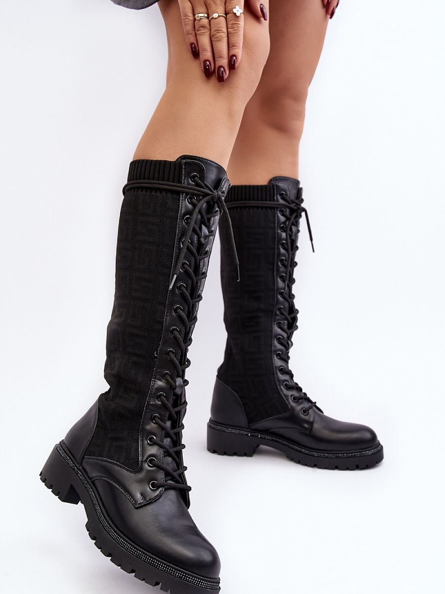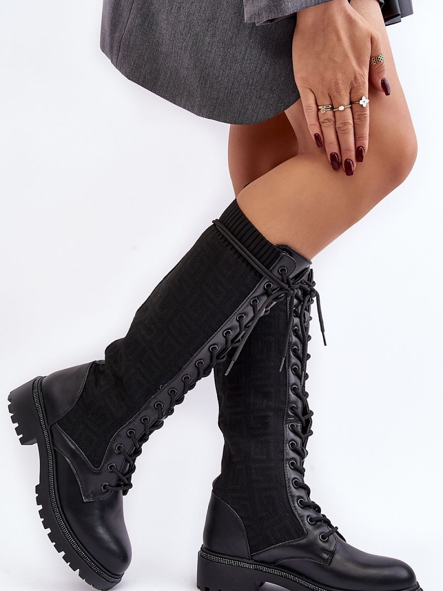 Women’s boots made of a combination of eco leather and textile material. Set on a flat heel. Rounded toe caps. Upper before the knee in the form of a sock. This model will be perfect for many autumn stylings! You absolutely must have them!