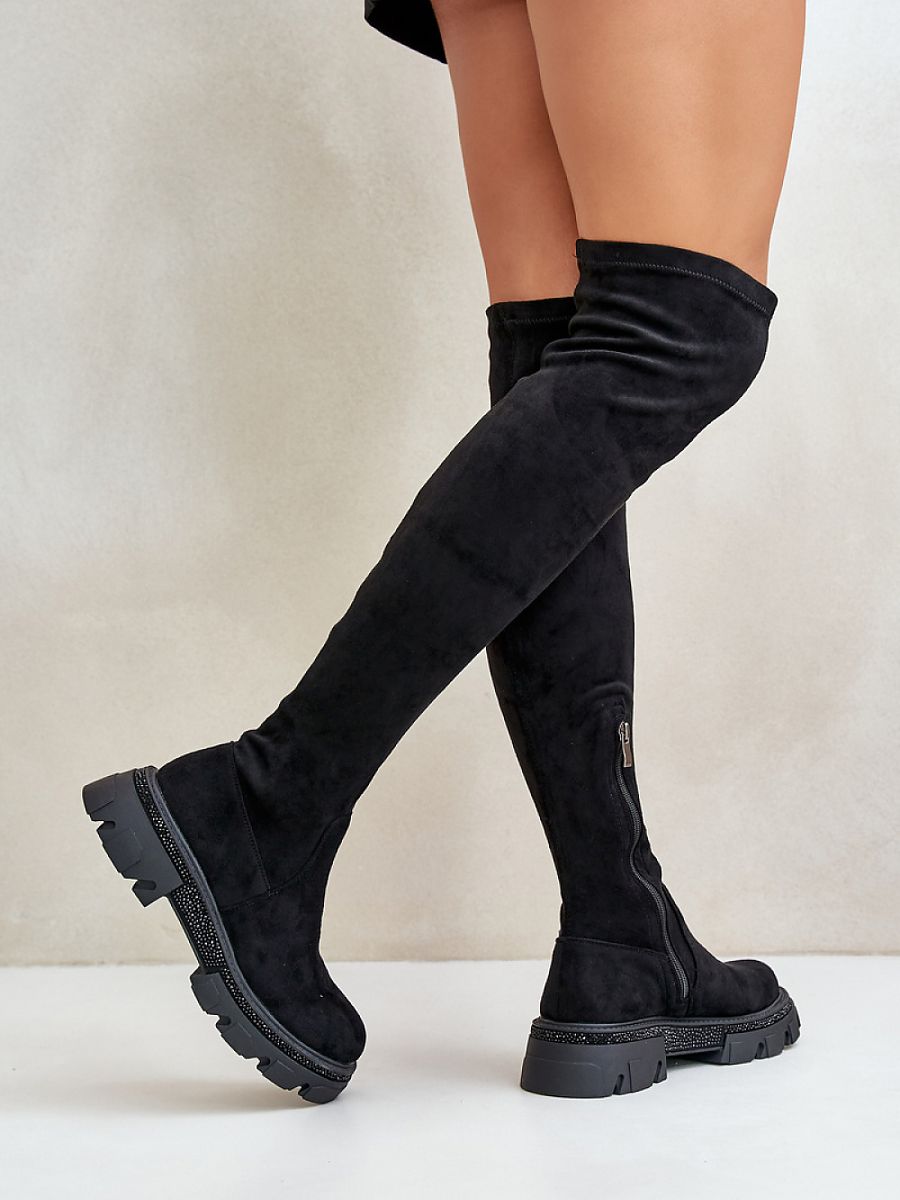 Women’s knee-high boots made of eco-suede. Mounted on a low heel. Slip-on model with an additional zip fastening. Rounded toes. Insulated with a shoe blanket only at the foot’s height. They will work great with short skirts or dresses. These boots must be yours!