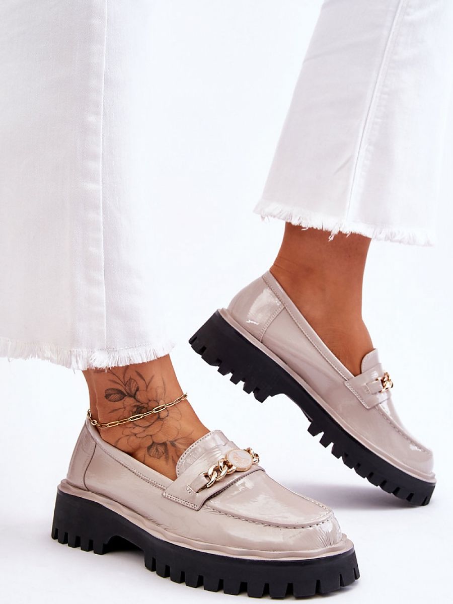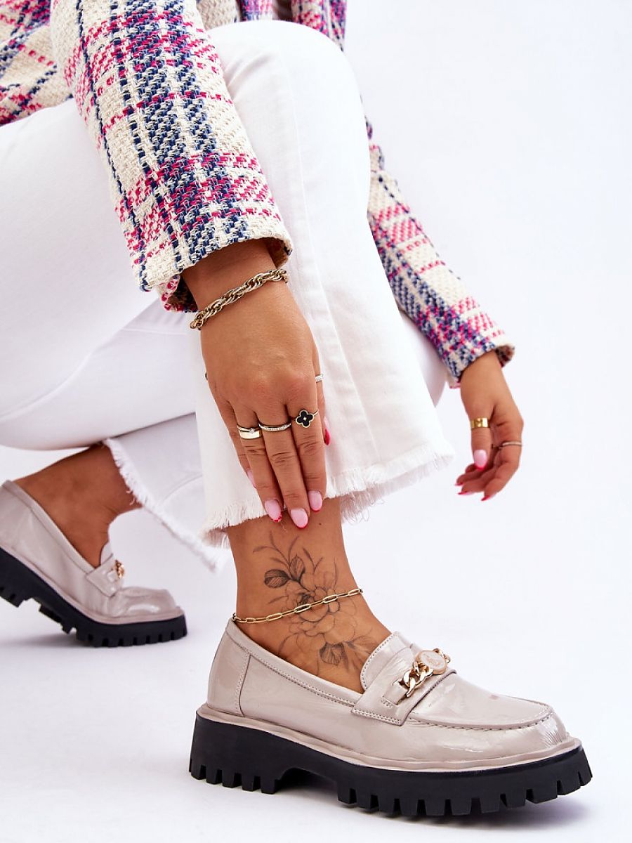 Wonderful moccasins made of eco leather! This cut will be perfect for the spring and autumn season. Ankle-length upper, with a decorative chain on the front. The sole is made of rubber material with a tread. The shoes are set on a platform and a flat heel. The soft, comfortable insole was made of natural leather. This model will be perfect for both casual and more elegant outfits!