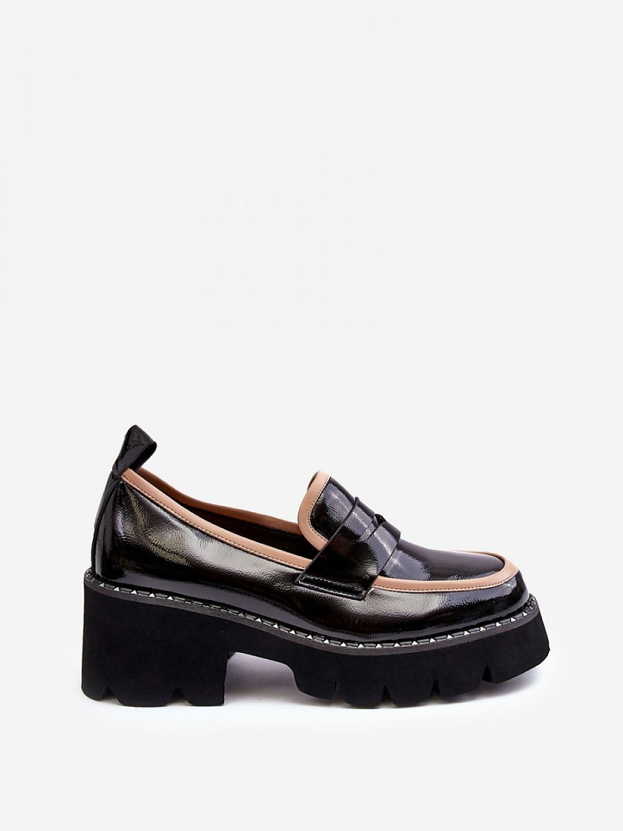 Women’s moccasins were made of eco leather. On the front they have a decorative strap with a cutout. This model was set on a flat heel and a platform, which was additionally decorated with studs. The moccasins have an insole made of natural leather. This model is great for the spring and autumn season!
