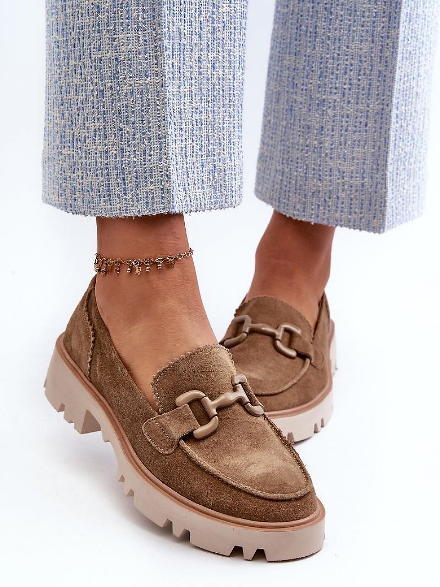 Women’s loafers made of natural suede. Set on a flat heel. An additional decorative element at the front gives them unique charm, making them an original addition to any outfit. Whether you’re meeting with friends or attending a more formal event, these loafers will be the perfect complement to your look, adding a touch of subtle elegance.