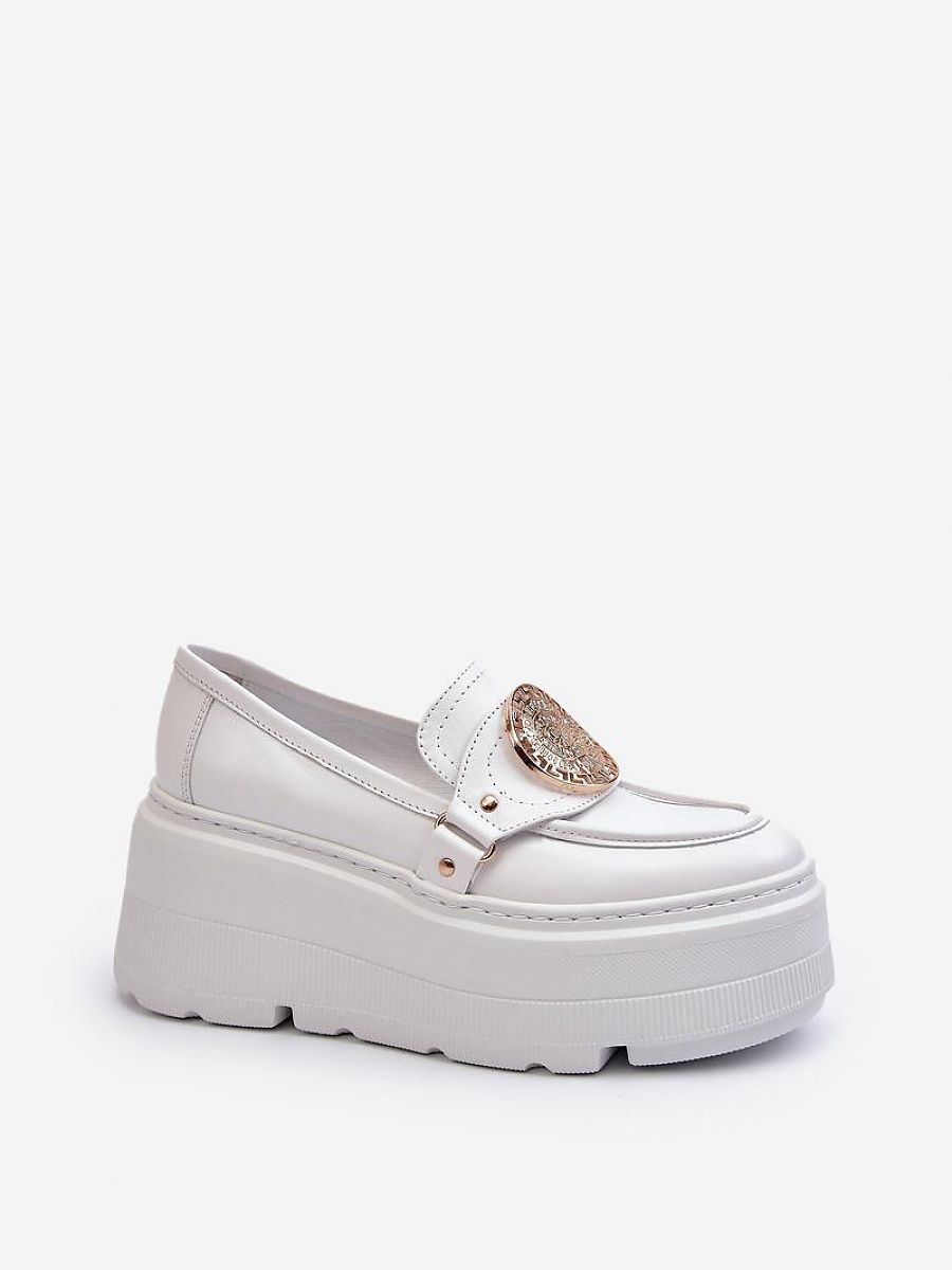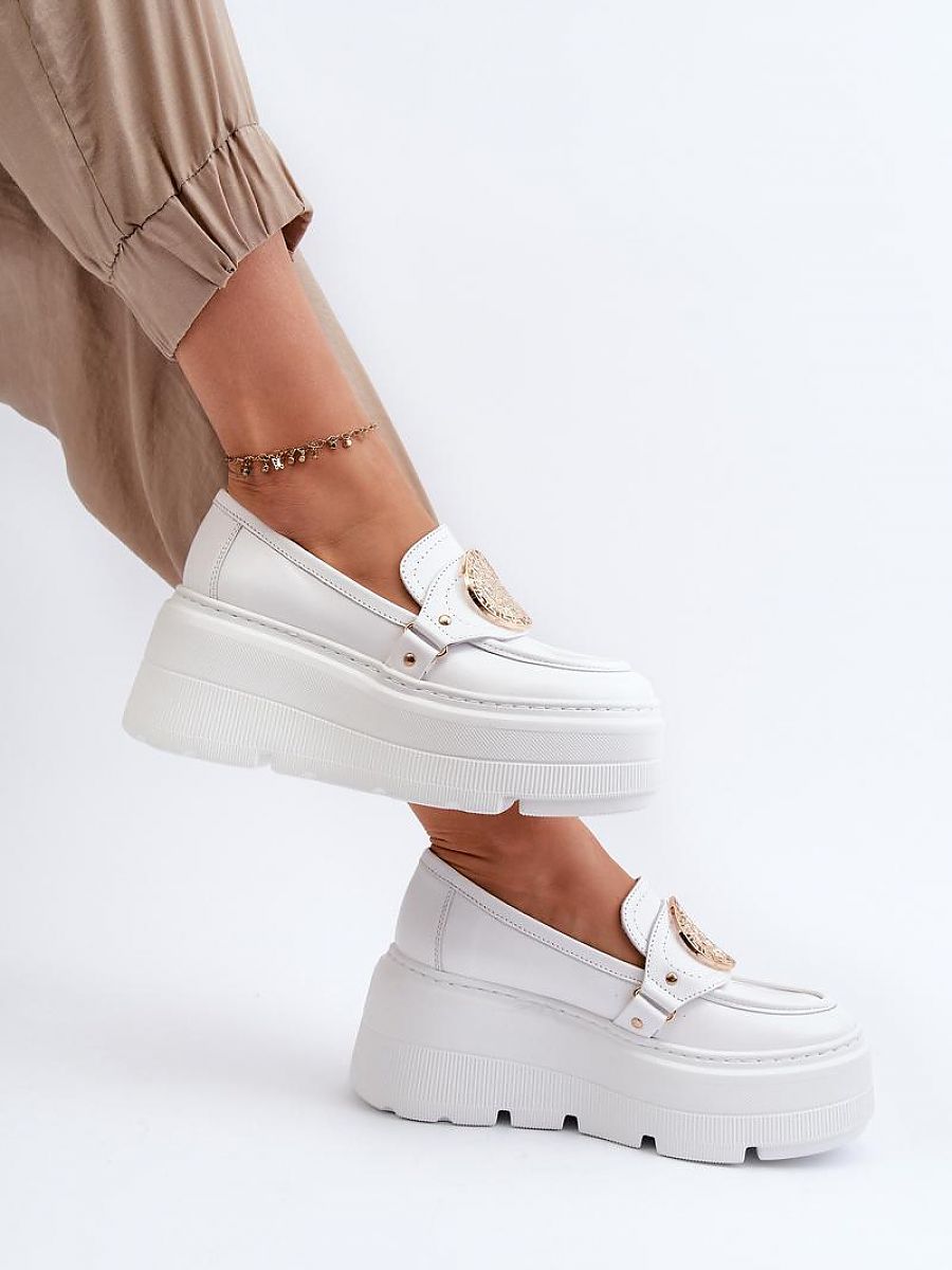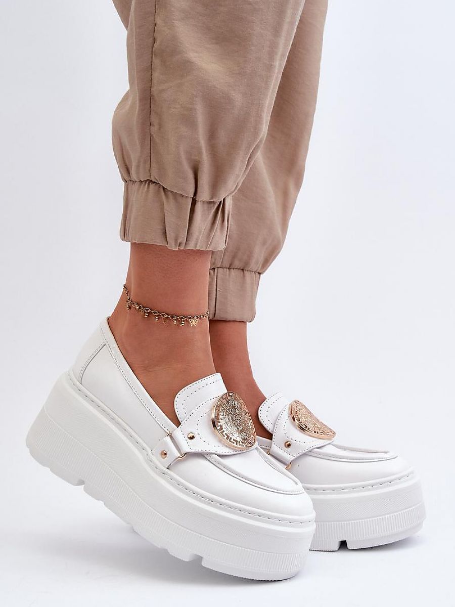 Women’s moccasins have been made from genuine leather with attention to detail. Set on a sturdy platform and wedge heel. The front is adorned with a strap featuring a gold ornament, adding elegance. Perfect for women who appreciate style and comfort!