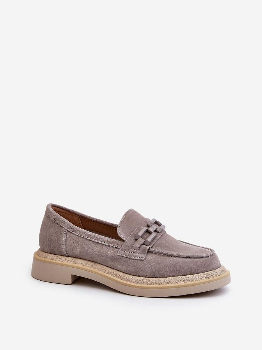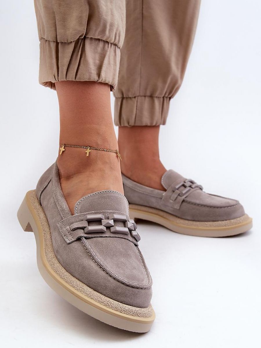 Women’s moccasins made of natural suede. The flat heel guarantees stability and comfort when walking. An additional decorative element on the front adds originality to them, which makes them not only practical, but also fashionable. These moccasins will be a perfect complement to many different styles, both casual and more elegant.