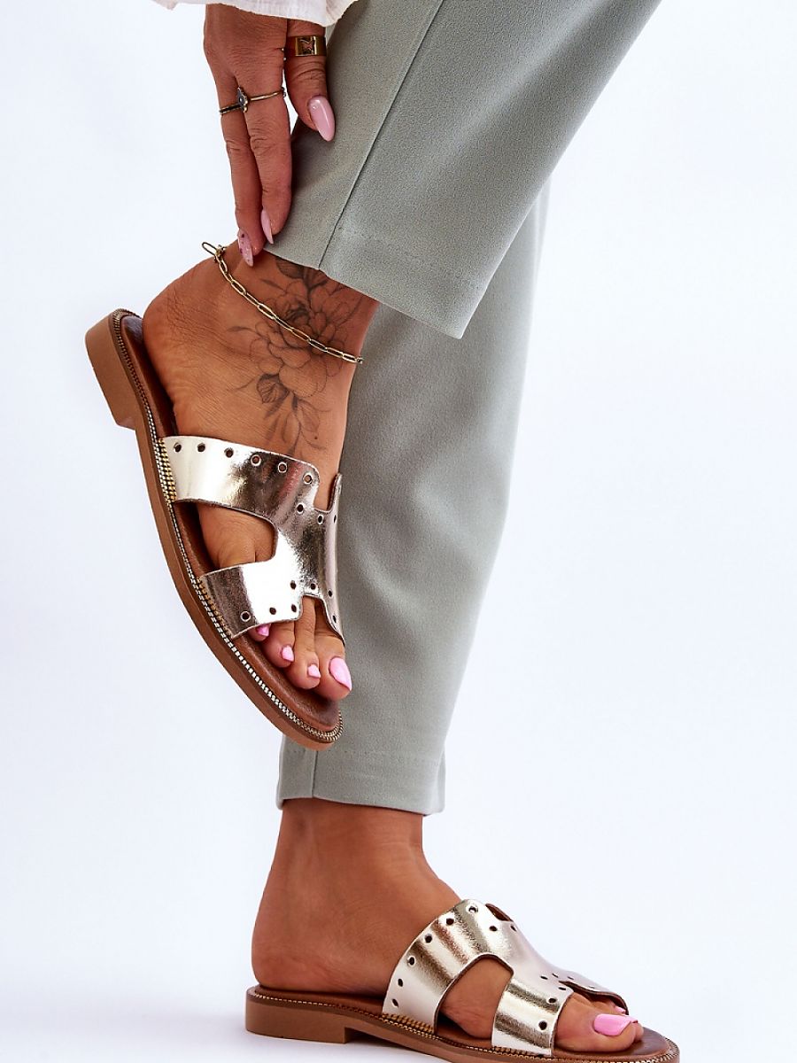 Women’s classic flip-flops were made of natural leather with cutouts. Set on a flat heel with a decorated sole. This model is sure to appeal to any woman who appreciates style and comfort. The soft leather insole will allow comfortable use of the shoes even throughout the day.