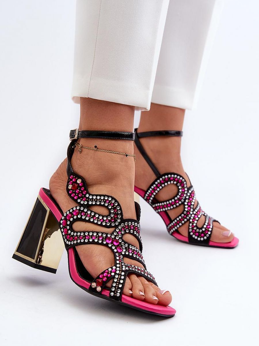 Elegant women’s sandals with embellishment. Set on a block heel. Fastened with an adjustable buckle strap. The soft, leather insole ensures comfort during wear. This model will definitely add shine to your outfit!